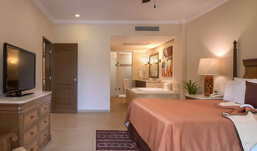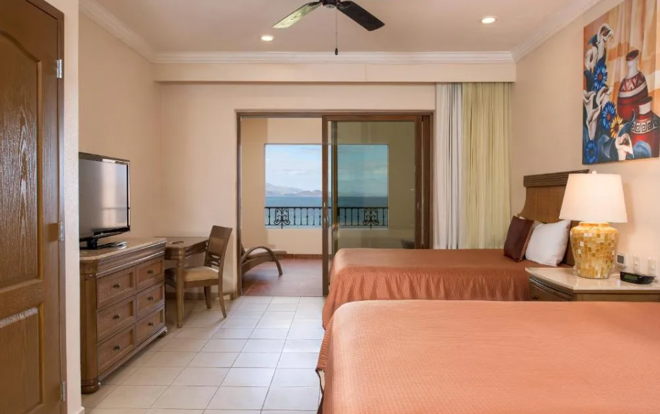 The Deluxe Suite at Villa del Palmar offers 645 square feet of spacious luxury with two queen-size beds or one king-size bed, a kitchenette, an LCD TV, and a large balcony with stunning views of the Sierra de la Giganta Mountain Range, TPC Danzante Bay, or the resort’s gardens and pool.
